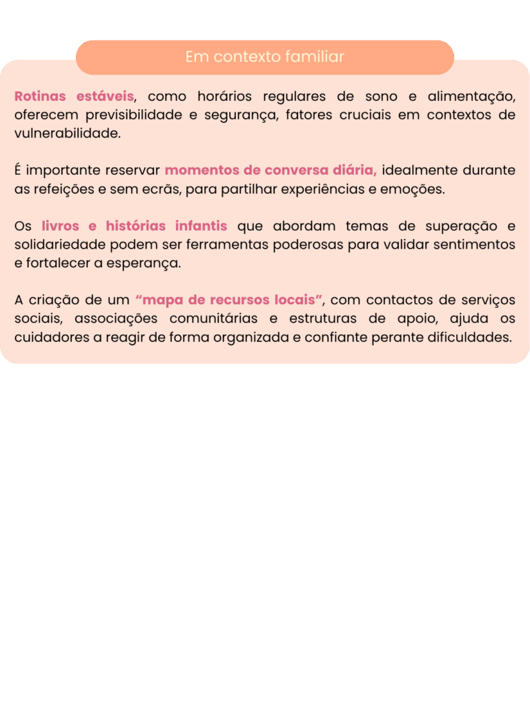 As crianças precisam de sentir que é legítimo ficarem tristes, preocupadas ou confusas perante a injustiça social. Quando o adulto acolhe essas emoções com empatia, está a oferecer um modelo de regulação emocional saudável.  Ao mesmo tempo, é importante reforçar uma visão de esperança e ação, mostrando que, mesmo em contextos difíceis, há sempre formas de cuidar, partilhar e contribuir para um mundo melhor. Nas idades mais precoces, entre os três e os seis anos, bastam explicações simples e concretas, que descrevam a realidade de forma compreensível. Por exemplo, “Às vezes, as famílias não têm tudo o que precisam. Isso pode deixar-nos tristes, e está tudo bem sentirmo-nos assim.”