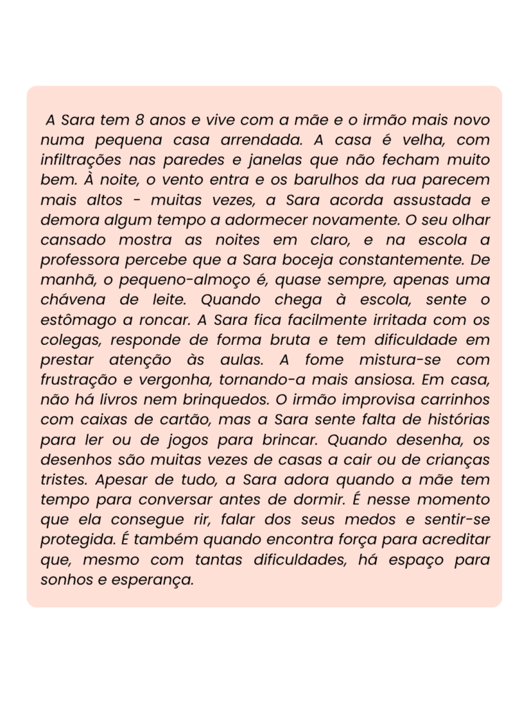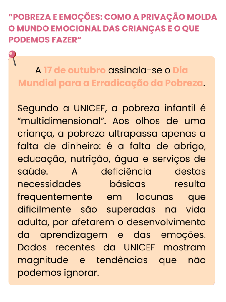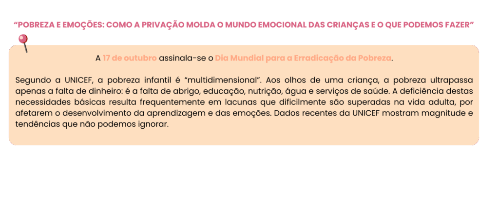 Erradicar a pobreza infantil não é apenas uma meta económica, mas um imperativo ético, social e emocional. Garantir que cada criança cresce num ambiente seguro, estável e afetivamente acolhedor é condição essencial para o seu desenvolvimento integral. Investir em proteção social, em escolas que promovam o bem-estar emocional e em programas de apoio psicossocial é investir no futuro coletivo, pois cada criança protegida emocionalmente é um adulto mais saudável, confiante e capaz de contribuir para uma sociedade justa. Combater a pobreza é, portanto, mais do que corrigir desigualdades materiais, é proteger o potencial humano e garantir que nenhuma criança é privada do direito de sonhar, aprender e prosperar plenamente.