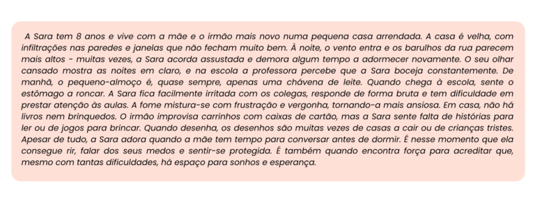 Já entre os sete e os onze anos, a criança começa a compreender relações de causa e efeito, o que permite introduzir pequenas reflexões e envolvê-la em gestos solidários, como campanhas de recolha de bens. Na adolescência, o diálogo deve tornar-se mais aberto e reflexivo, explorando as causas estruturais da pobreza e incentivando o pensamento crítico, o voluntariado e o envolvimento cívico. Pais e educadores devem ainda estar atentos a sinais de sofrimento persistente, tais como, alterações do sono, regressão comportamental, isolamento social ou sintomas físicos sem causa médica evidente e, nesses casos, procurar apoio profissional junto do médico de família, do psicólogo escolar ou dos serviços de saúde mental infantil. Mais do que transmitir informação, falar sobre pobreza é, em última análise, ensinar empatia, responsabilidade e humanidade.