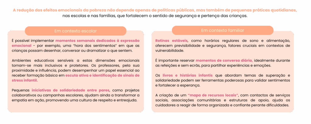 Estas práticas simples, mas consistentes, ensinam às crianças que pedir e oferecer ajuda são gestos naturais de convivência humana. Ao mesmo tempo, reforçam a ideia de que o cuidado coletivo é uma forma concreta de combater a pobreza e as suas repercussões emocionais.